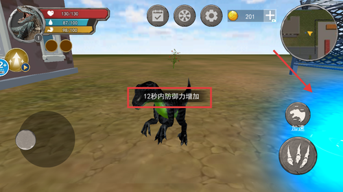 3、触发“12秒内防御力增加”Buff后立即点击加速,快速移动以高效应对野兽突袭或展开狩猎。