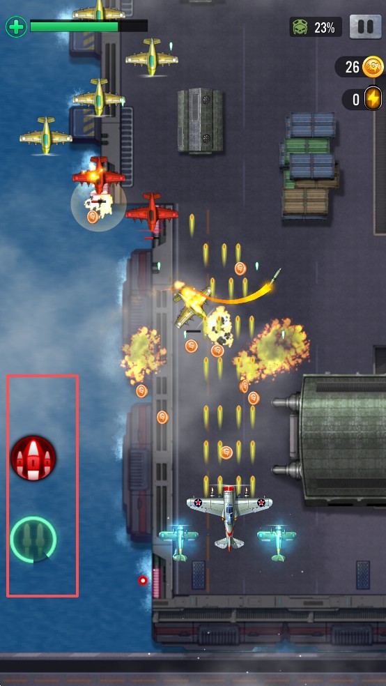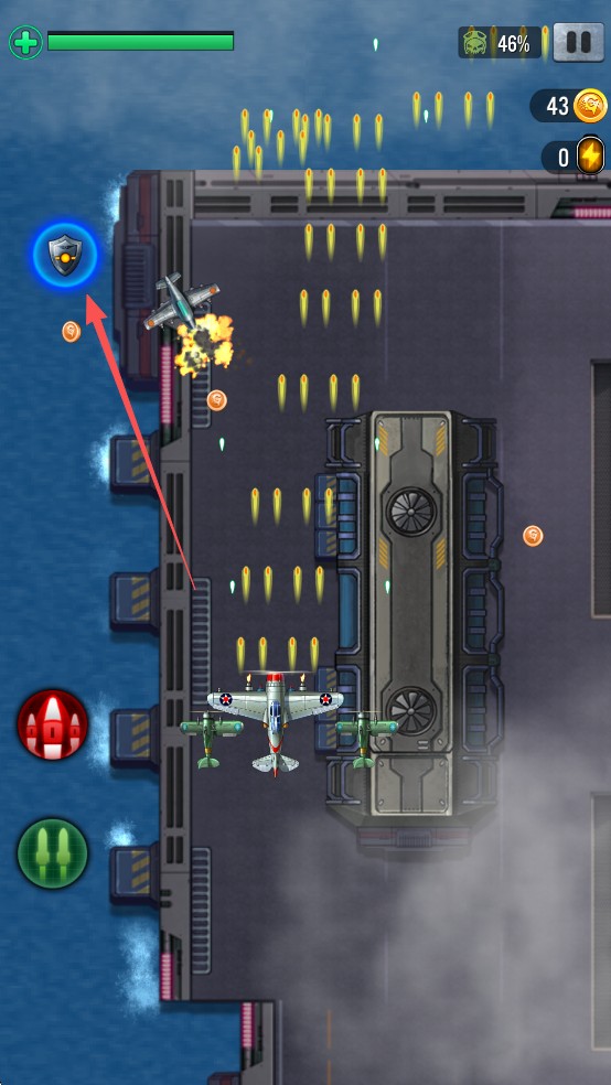 2、使用金币就可以购买各种辅助道具,僚机、炸弹、追踪弹等多种科技。