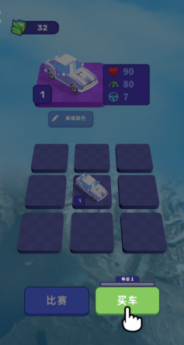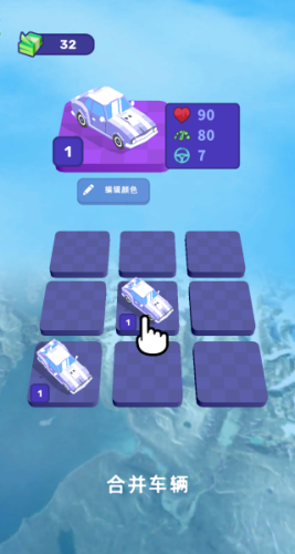 3、利用金币去购买车辆,目前的等级是1,买2辆,相同的还可以合成。