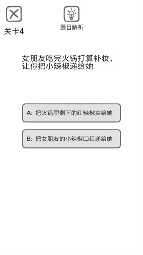 4、网上常看到女性朋友吐槽男朋友或老公不懂自己,这款游戏就适合读不懂空气的你!还在愁女朋友为啥天天生气,自己明明没做啥吗?这款游戏能帮到你。