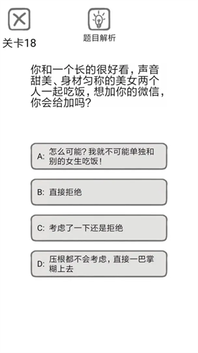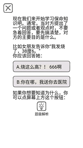 5、游戏就是想帮广大男同胞在生活里快速解决各种问题,形成强大的保护圈,完美应对女友的各种刁钻问题。文字剧情操作,不同答案效果不一样,能根据答案了解玩法,来试试吧。