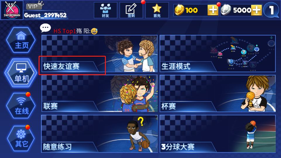 4、装备好后,先来练习一下,点击【快速友谊赛】。