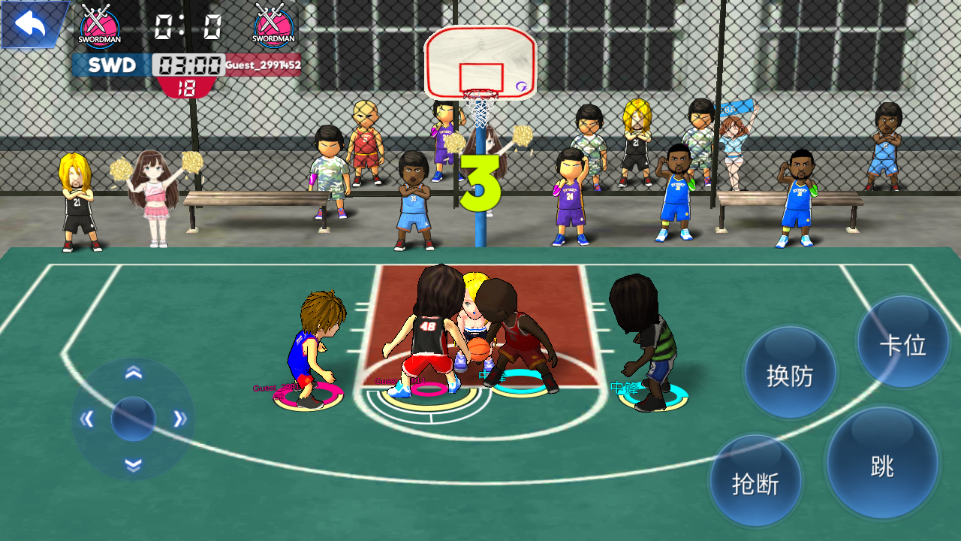 7、之后就进入比赛了,左方的按钮控制角色的移动,而右方则是一些技能。在倒计时结束以后,就可以点击【跳】抢球。