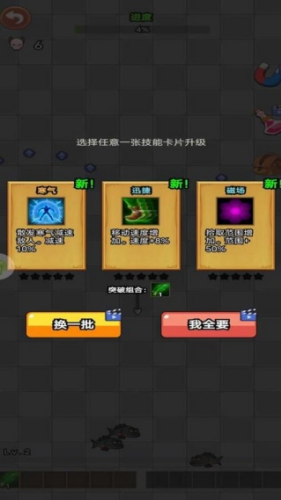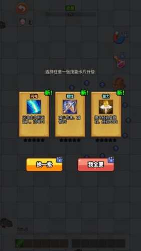 3、击杀敌人会掉落经验值,利用获取的经验值来提升技能卡,强化自身属性。