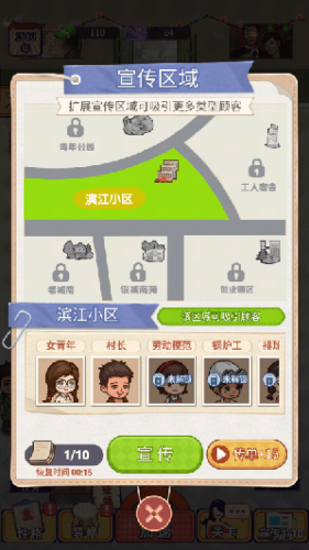 4、点击宣传,招揽滨江小区等新区域顾客,解锁更多角色类型与剧情互动。