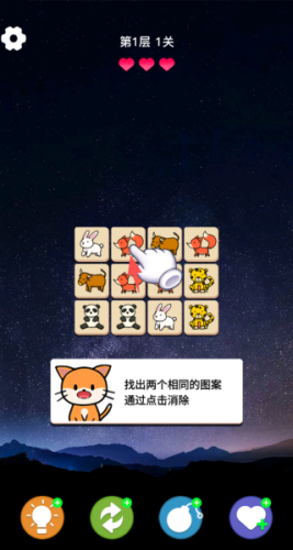 1、主要的玩法就是,在场景中,去找到两个相同的图案进行消除,直接点击就可以了。
