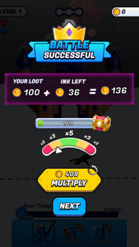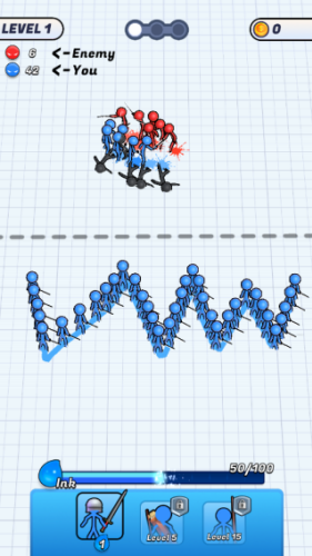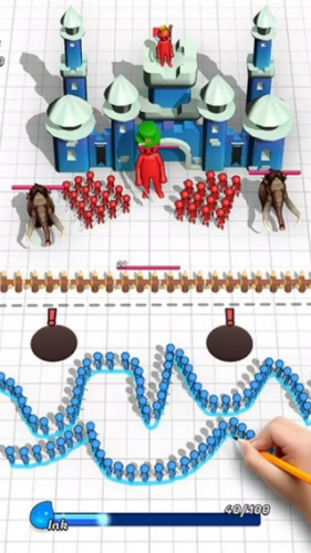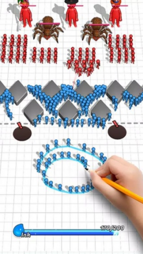 2、核心玩法:玩家通过画线的方式指挥火柴人军队,墨迹路线决定部队的行进轨迹。这种“绘画指挥”机制要求玩家策略性地规划路径,利用地形优势(如高低差、障碍物)实现跨层攻击或包围敌人。