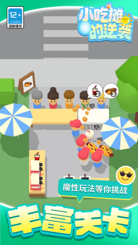 小吃摊的逆袭破解版最新版是一款卡通风格的经营模拟游戏,玩家将扮演一位热爱美食的街头小贩,通过经营自己的小摊,挖掘各种独特的美食,吸引顾客,逐渐壮大自己的美食帝国,选择自己喜欢的街头小贩形象,每个形象都有自己独特的技能和特长,通过经营自己的小吃摊获得收益。从一辆小小的手推车开始你的美食帝国之路,亲历食材采购、烹饪出餐到营收管理的完整流程,每一步操作都还原真实摆摊的烟火气与成就感,百余种特色小吃解锁,涵盖各地经典风味与网红创意品类,搭配专属制作工序,让烹饪过程充满细节趣味与新鲜感,有喜欢玩美食摆摊的朋友一定要来下载试一试,玩起来还是非常不错的。