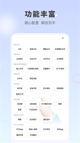 1、基础点击:包括普通点击、连续点击、匹配点击、区域随机点击、点击颜色等,可精准定位屏幕坐标或内容进行操作。