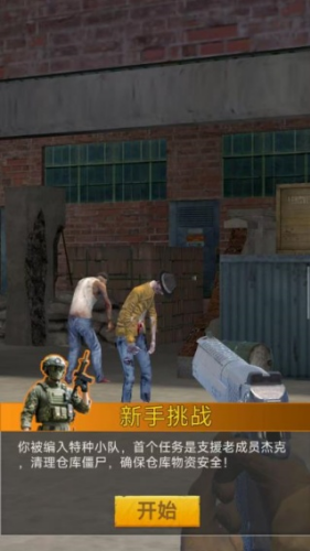 1、进入到新手挑战之中,成为特种小队,你的任务就是将仓库的僵尸全部歼灭。