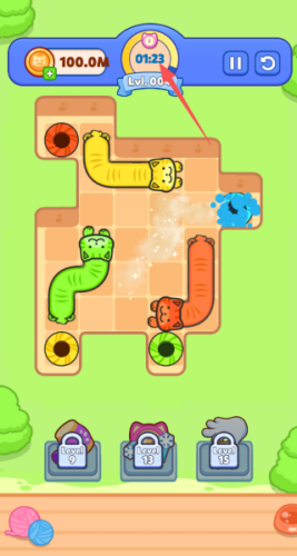 2、玩家要操控有液态特性的猫咪,通过伸缩调整形态、滑动穿越障碍,在时间耗尽前为每只猫咪规划逃脱路线,引导至目标点。