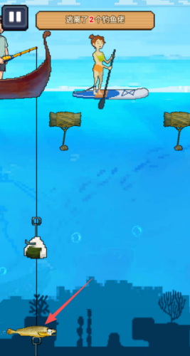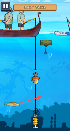 3、聚焦躲避威胁的核心玩法,在水中设计多样潜藏危险,如钩子等,让每一次移动都充满不确定性,提升游戏惊险感。