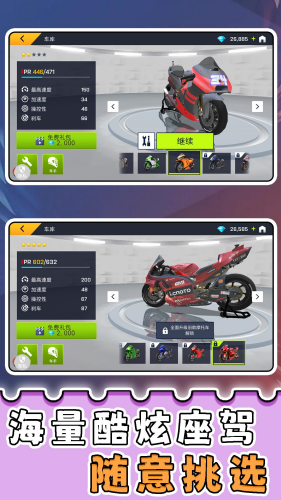 6、强力摩托车逐步解锁,每一款车都有独特的性能设计,合理安排驾驶策略,让你在赛道上如鱼得水。