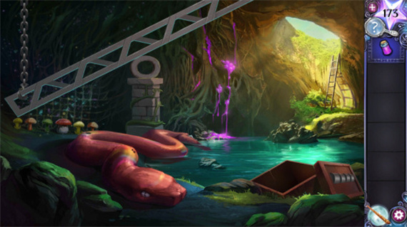 7、回到守卫室用魔法软泥将大锅填满,放入获得的蛇鳞片,然后回到洞穴向蘑菇释放肥料,让那些蘑菇生长起来将巧玲支柱撑起来,将白蘑菇生长到顶,粉红蘑菇生长两次,最后回到洞穴上方就会发现桥梁已经放下来了,就能向着沼泽出发了。