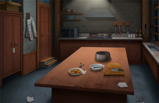 进入厨房,先收集碎纸片5/6.然后收集桌上的毒药线索,墙上挂着的衣服名牌和兜中的烟盒拿到,拿墙上挂着的用具,对着锅中用一下(做好准备)。