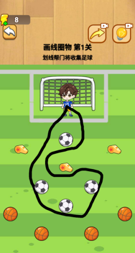4、第一关的任务是你要通过画线帮助门将收集所有的足球,全部收集就能过关。