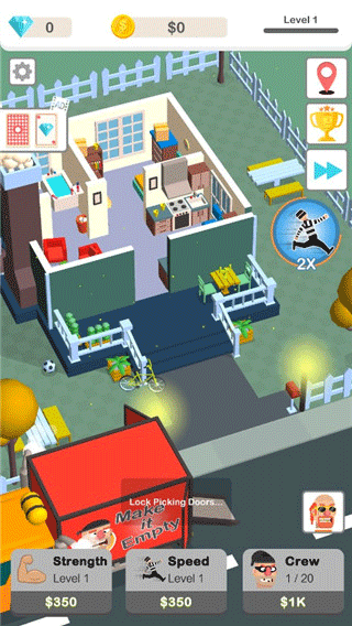 1、扮演强盗小偷类型的角色去进行搬家闯关的挑战,很新颖有趣的玩法方式。