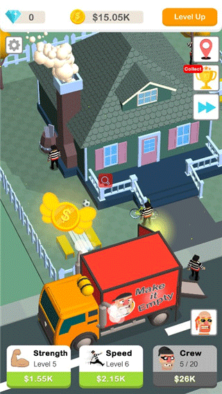 猛男搬家手游内置mod版是一款十分模型的休闲手游,游戏里你扮演的可不是什么搬家公司老板,而是一个有理想有追求的强盗头子,目标就是在警察叔叔赶来之前,指挥你那一群画风清奇的小弟,把眼前看到的一切,没错,是一切东西,统统搬空。游戏玩法直白到不用动脑,戳戳屏幕派遣小弟,看着他们吭哧吭哧地把电视、沙发、保险柜甚至盆栽都扛走,那种洗劫一空的爽快感,配合上色彩鲜艳又带点滑稽的立体场景,确实让人有点上头。玩猛男搬家手游内置mod版这款游戏根本不需要什么复杂的策略,享受的就是那种看着进度条被迅速填满的即时满足,以及小弟们摇摇晃晃搬着巨大物品的搞笑场面。饱和度很高的色彩搭配立体感的场景与角色,整体营造出一种热闹又无厘头的卡通氛围,光是看着都觉得心情明亮,非常适合想要放空大脑、纯粹找点乐子的时刻。