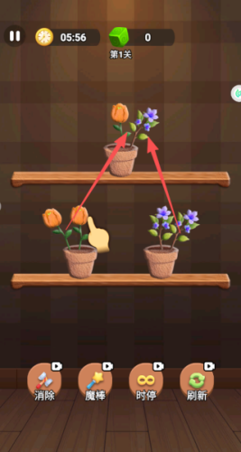 1、经典的消除的玩法,主要是需要将三多相同颜色的花费放入到一个花盆中进行消除。