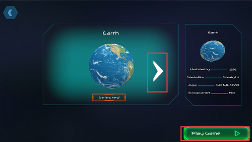 1、点击向右按键切换星球,选择Earth后点PlayGame,正式开启太空探索旅程。