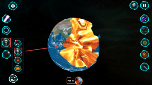 2、进入行星毁灭模组,点击外星生命图标对地球释放,触发火焰蔓延的毁灭进程。