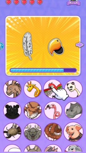 2、进入看图猜动物关卡,根据上方出现的部位特征,在下面众多的动物中选出对应的动物就可以完成任务。