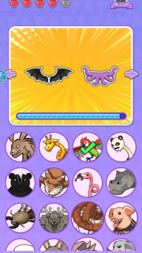 1、每轮游戏会展示三个天马行空的动物特征,如会跳芭蕾的刺猬,并给出多个动物选项供玩家选择匹配。