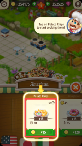 1、看到厨师提示后,点击PotatoChips卡片,即可开始制作只需5秒完成的薯片美食。