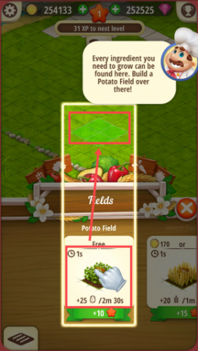 3、在农场界面中,将PotatoField拖到绿色草地格子上,等待一段时间即可收获作物。