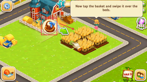 1、点击带蓝蝴蝶结的篮子,按指引划过麦田,收集成熟作物,感受丰收的喜悦。