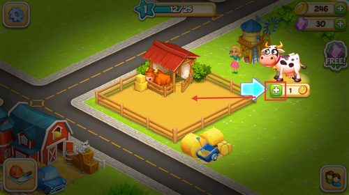 3、在牛棚旁点绿色加号按钮,用金币购买奶牛,扩大畜牧规模增加产出种类。