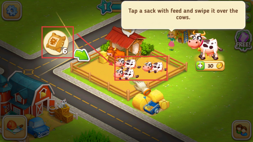 4、点击左侧饲料袋图标,拖动划过牛群完成喂食,保障奶牛健康提升养殖收益。