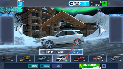 1、进入车辆选择页面后,点击DRIVE按钮,选择TROOPER车型开始你的雪地任务。