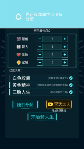 4、可调整初始属性,也可随机分配,最后点击开始新人生。