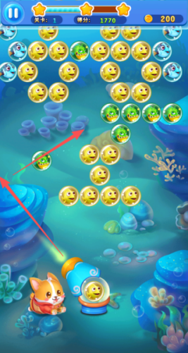 1、我们直接点击发射的地方,拖动调整角度去进行射击,消除上方的各种泡泡。