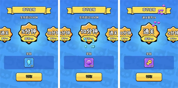 记得每次通关都领取下,有一把宝箱钥匙,分别为5分钟奖励、10分钟奖励和15分钟奖励。