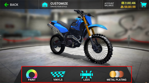 3、玩家可以根据自己的喜好对摩托车的性能外观进行不同的修改,操作非常自由没有任何限制。
