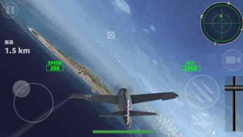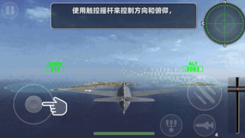 3、飞机进入飞行状态,使用触控摇杆来控制飞机的方向和俯仰,根据飞行路线来进行飞行。