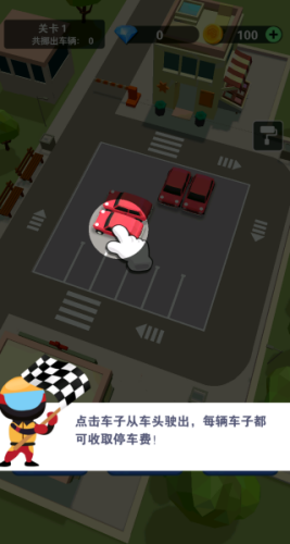 2、根据手指的指示去点击车子,让车子从车头驶出,每辆车子都可以收取停车费。