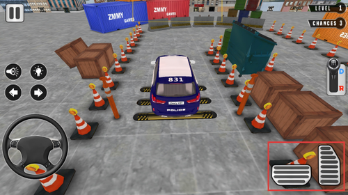 1、进入游戏,控制右侧刹车和油门踏板,平稳启动车辆,准备挑战停车关卡。