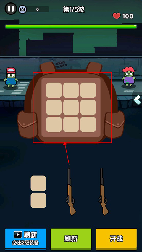 2、玩家在关卡每波开始前都可以选择装备放入背包,只要背包放的下,就可以全选。