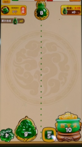 1、游戏以招财进宝为主题,所有合成物品均为元宝、金砖、玉器等传统财富象征,视觉上金碧辉煌,寓意吉祥。
