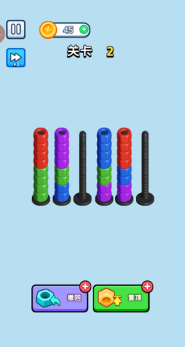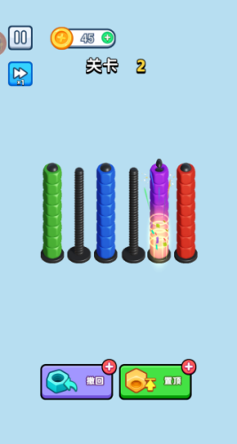 1、游戏中点击任意螺丝即可进行移动,将其放置到空柱子或者最上方有相同颜色螺丝的柱子上。