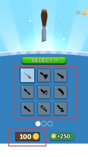 1、进入工具界面后点击SELECT按钮选择当前使用的小刀,也可花费100金币解锁更高效的新工具。
