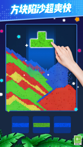 2、流沙物理特效逼真细腻,方块坠落如流沙漫散,填充间隙的动态视觉极具沉浸感,每一次操作都有沉浸式反馈。