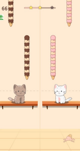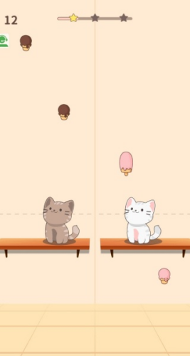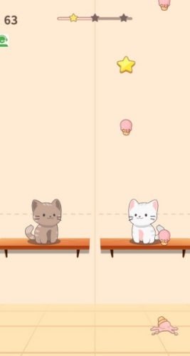 2、在游戏中玩家需要点击屏幕让两只猫咪吃到事食物,食物是不可以掉落的。