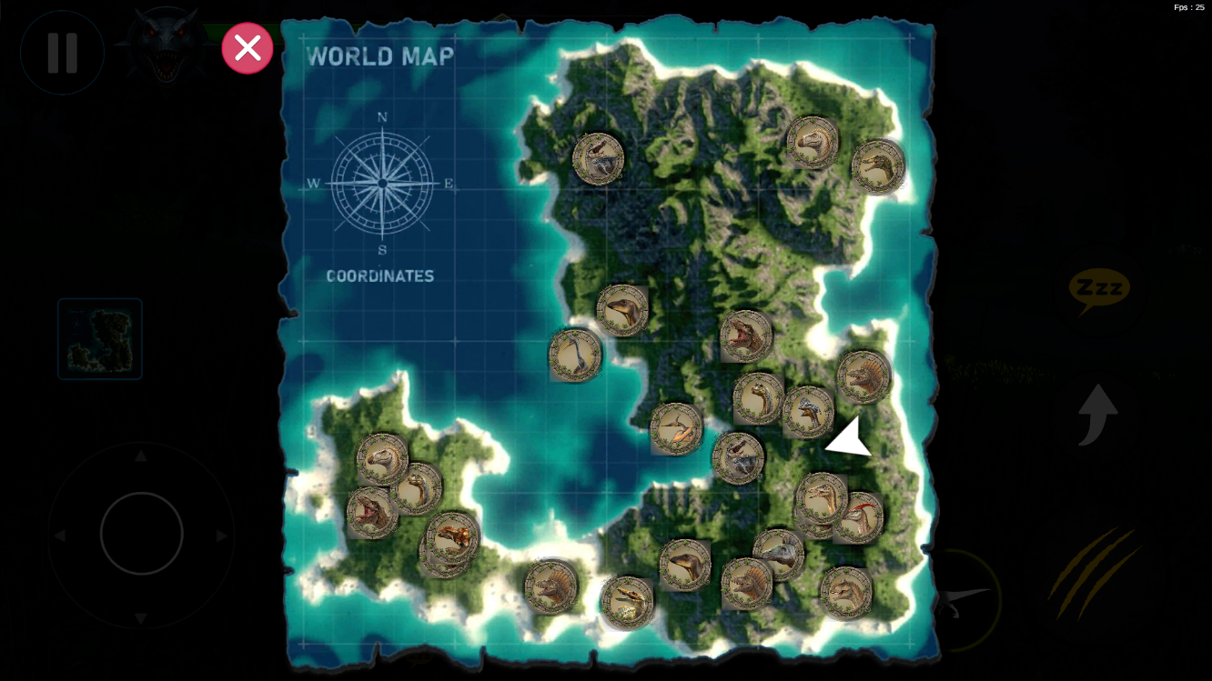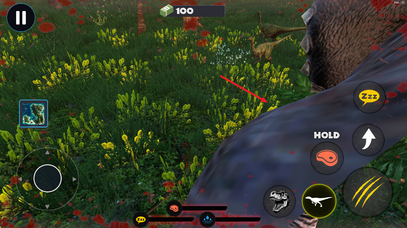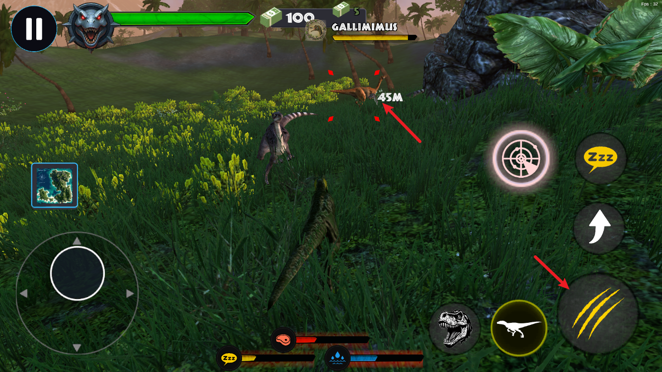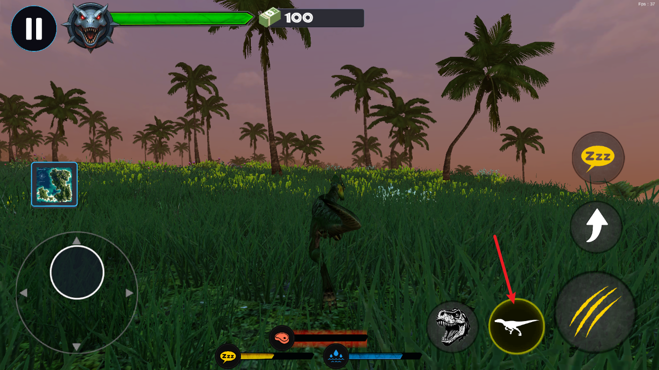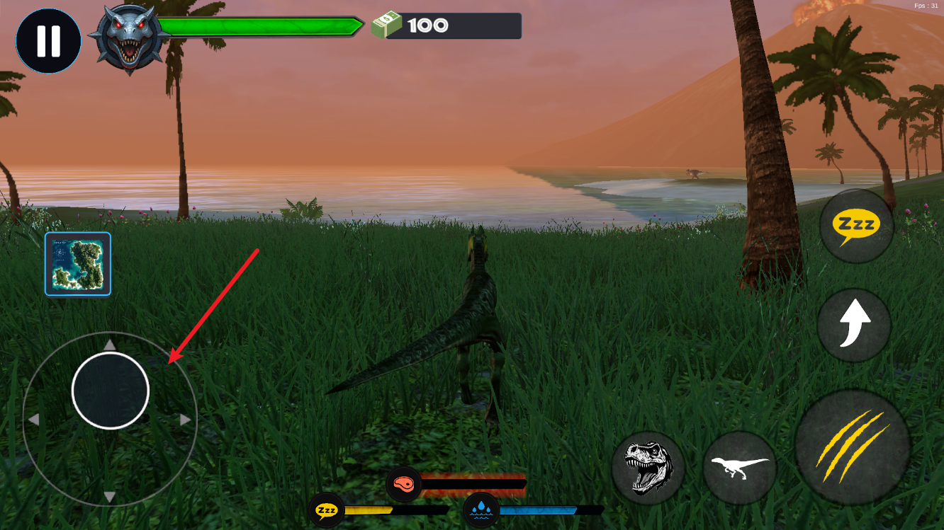 2、屏幕左侧的虚拟摇杆,控制恐龙的移动方向,长按可实现持续移动,方便追击或躲避敌人。