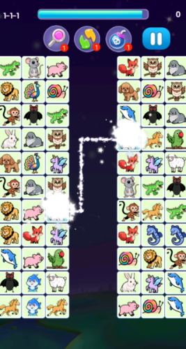 1、在开心脑洞消除中,软萌小动物填满屏幕,只需用不超过三条直线连接两个相同角色即可消除。