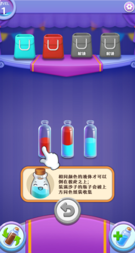 2、第一关很简单,跟着手指的指示去点击瓶子,很快就能倒水成功。