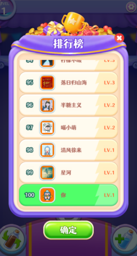 3、完成闯关之后,还有排行榜为你显示,你的排名是100。
